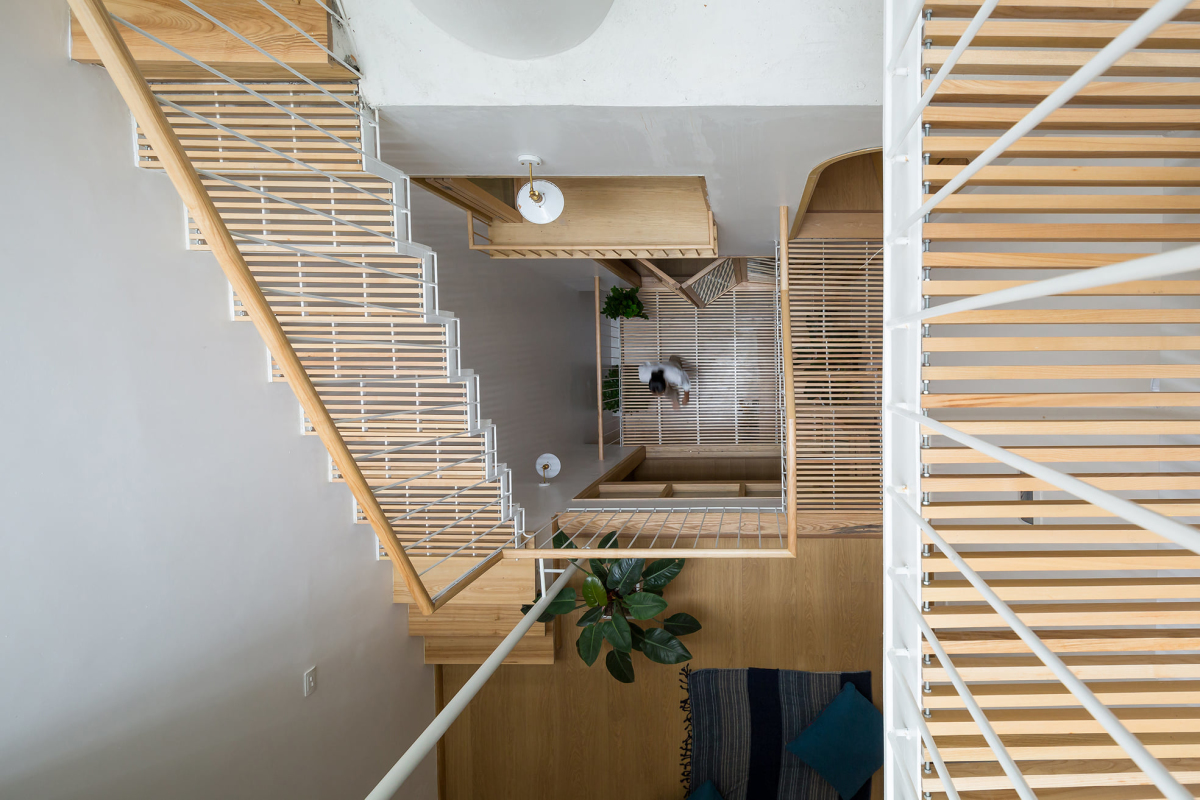 Một trong những nhược điểm lớn nhất của nhà ống là thiếu sáng. Để giải quyết vấn đề này, bên cạnh việc bố trí giếng trời, nhiều văn phòng còn làm cầu thang có bậc rỗng, bậc bằng lam gỗ hoặc kim loại đục lỗ để tạo khoảng hở, đưa ánh sáng xuống sâu bên dưới. Ngoài mục đích lấy sáng, bậc thang hở cũng giúp không gian nhà nhẹ nhàng, thoáng đãng hơn.