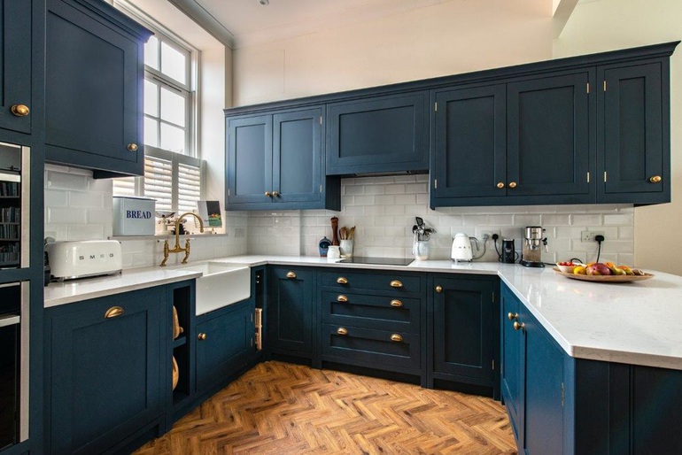 Màu xanh lam đậm cũng là phông nền hoàn hảo cho các điểm nhấn bằng kim loại, chẳng hạn như vàng và đồng kiểu cổ. Chúng cũng sẽ tạo giúp hoàn thiện cho căn bếp của bạn vào năm 2022. Các chi tiết mạ đồng như vòi rửa hay tay nắm cửa sẽ vẫn tiếp tục thịnh hành trong năm tới", Jenni Greenwood của Greenwood Interior Design cho biết.