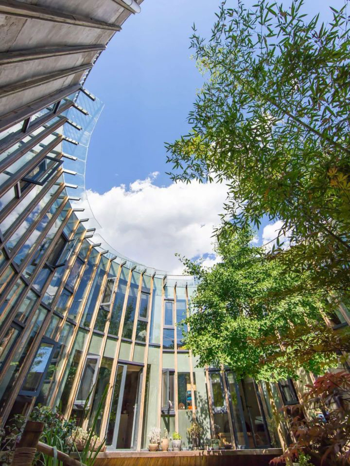 Toàn bộ sân là một bức tường bằng kính, làm mờ ranh giới giữa trong nhà và ngoài trời, đồng thời mang thiên nhiên vào bên trong. Bởi vì là hình tròn, những đứa trẻ có thể nhìn thấy cha mẹ từ bất kỳ góc độ nào.