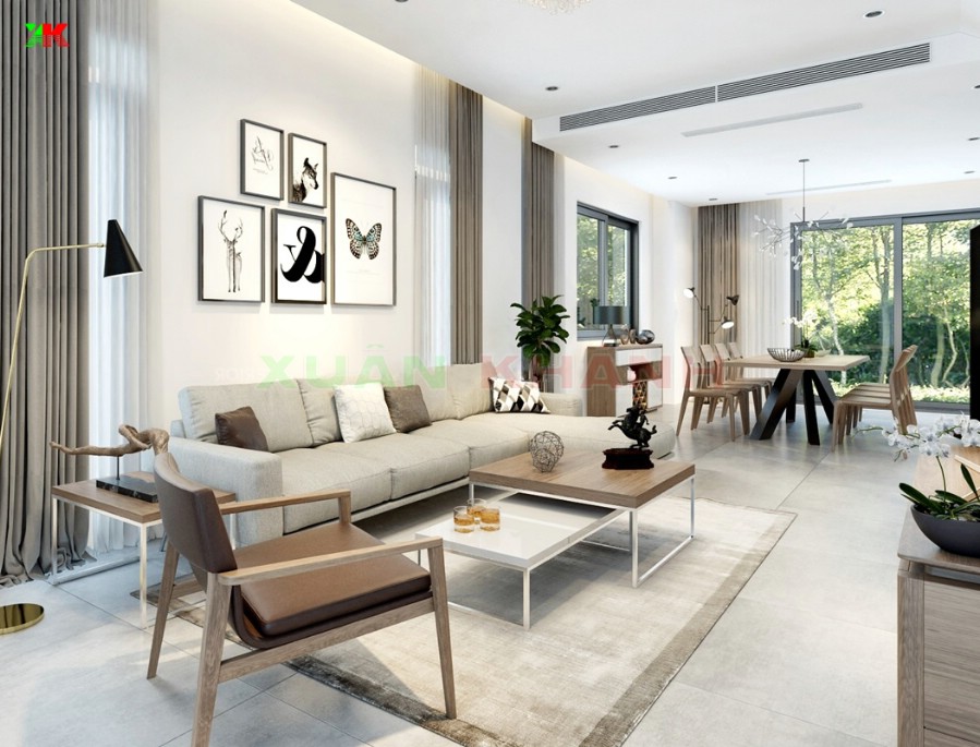 Phòng khách gần như là không gian quan trọng bậc nhất trong nhà ở căn hộ. Nội thất trong thiết kế này sử dụng tông màu trung tính, trắng – xám làm chủ đạo. Đây là gam màu rất phù hợp với phong cách hiện đại cho căn hộ của bạn