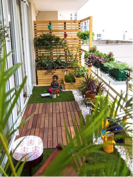 Mẫu ban công này được tạo ra để dành cho những người nào thích đọc sách ngoài trời và ăn nhẹ tại đây. Đây là phần mở rộng nội thất của ngôi nhà với những mảnh ghép thiết kế độc đáo tạo sự thích thú với bất kỳ ai ngồi tại đây. Đầu tiên hãy sử dụng một thấm thảm với màu rực rỡ đặt trên nền sàn bê tông vừa để chống bẩn, chống nóng lại vừa để trang trí cho không gian thêm hài hòa hơn. Tiếp theo tới bộ bàn uống cafe có độ đàn hồi cao tạo nên sự thoải mái khi ngồi đọc sách và khiến đầu óc của mọi người có cảm giác thư giãn hơn. Ban công với tường và sàn lát ván gỗ.    Một bức tường lát ván gỗ tạo vừa tạo nên sự hoang dại vừa khiến cho không khí mát mẻ hơn. Trên tường treo thêm một vài chậu hoa và đèn dây nối khiến sắc thái hài hòa và lung linh vô cùng đặc biệt là vào buổi tối. Ghế gỗ kèm đệm êm ái chống chịu thời tiết, sàn gỗ mộc mạc có thể tận dụng làm chỗ ngồi thoải mái. Trồng thêm một vài chậu cây cảnh to bên cạnh giống như đây là khu rừng nhiệt đới vậy. Ban công bảo mật cao với chi tiết tường bằng gỗ.   Một ban công đẹp được bao bọc kín mít bởi một hàng tường gỗ được khắc chi tiết, vừa kín đáo nhưng vẫn rất thông thoáng. Kết hợp thêm một vài đồ dùng nhỏ như ghế nôi treo, một vài chậu cây xanh treo ngang tường làm cho không gian lúc nào cũng tràn trề sức sống với màu cam, vàng và xanh lá.