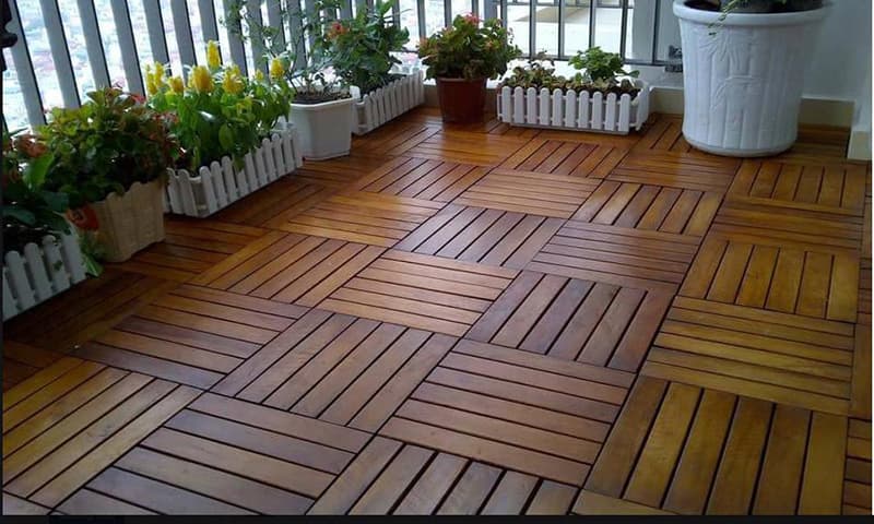Ban công sàn gỗ ghép.
